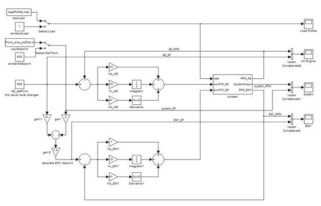 Develop a system to achieve target output speed of a hybrid powertrain with varying inputs from a compressed air engine and electric motor.